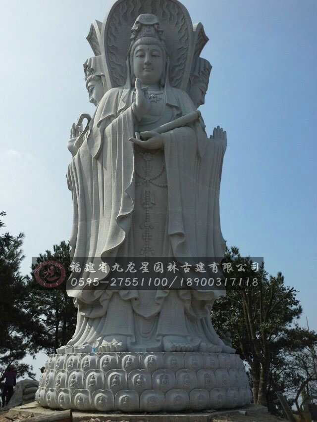 石雕三面觀音,字面意思就是一個(gè)觀音像有三個(gè)面,一般是正面的觀音手持經(jīng)篋,相鄰的右邊的觀音持蓮花,在其左面的觀音手持念珠,這三個(gè)面的觀音,手持經(jīng)篋的觀音象征這智慧,手持蓮花的觀音象征著平安,手持念珠的觀音則象征著仁慈。每一個(gè)觀音像都蘊(yùn)含著大智慧。正面的觀音體現(xiàn)著觀音的般若德即智慧德性,意思就是徹底擺脫無(wú)明煩惱和種種束縛,并且達(dá)到大自由、無(wú)束縛、大自由的境界。石雕三面觀音的整體概括智慧、慈悲、和平的精神象征。