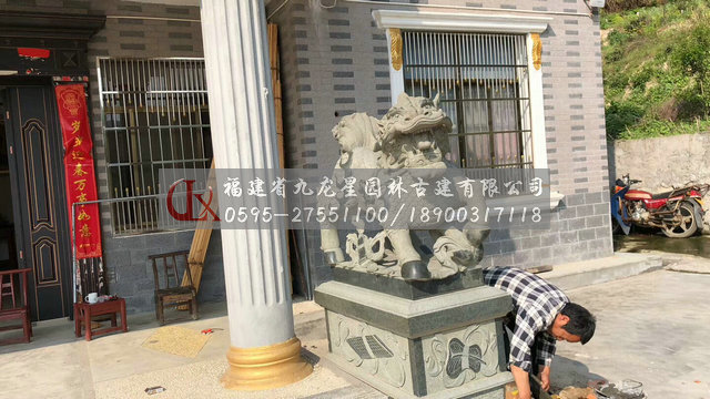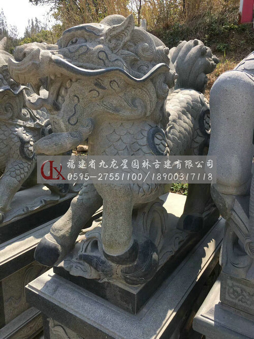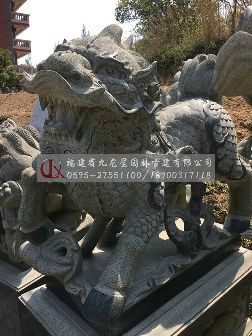麒麟造型中石刻麒麟多在建筑、皇家建筑里出現(xiàn),其體型巨大,多以威武雄健之態(tài)出現(xiàn)。這說明,麒麟造型的比例尺寸大小是與特定的環(huán)境、風俗、情感相聯(lián)系的。石雕麒麟的大也可以解釋為大氣、圣威、權利,具有震懾的作用。石雕麒麟的造型遵循著傳統(tǒng)文化審美的習慣,麒麟的造型特征說明其造物意象充滿了對美好與吉祥的期望。石雕麒麟的整個造型集龍頭、鹿角、獅眼、虎背、熊腰、蛇鱗、馬蹄、豬尾于一身,另外使用添加手法在下頜處加有長長的胡須,又添加翅膀,這樣,麒麟可以奔跑,可以飛翔,威武之勢讓人可望不可及。麒麟體現(xiàn)了古人對現(xiàn)實世界的主觀理想與造物的主動性,其和龍、鳳一樣成了我國傳統(tǒng)民族精神的象征。還有,石雕麒麟的擺放一般是成雙成對出現(xiàn)的,主要因為其造型講究碩大豐滿,還注重陰陽相守,忌諱殘缺不全、形單影只,其中寄托了人們“天人和諧”的精神追求,內(nèi)涵獨特而豐富。